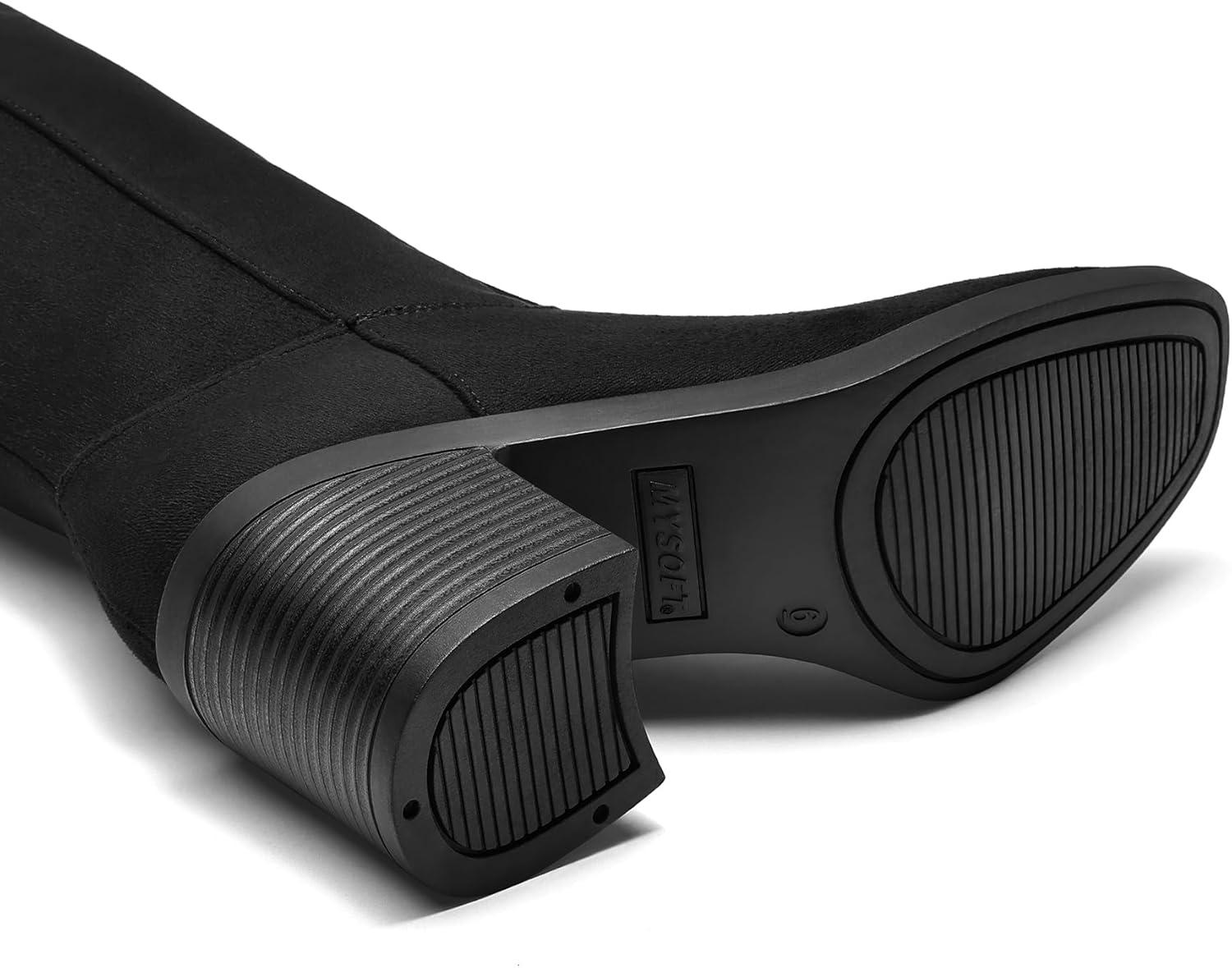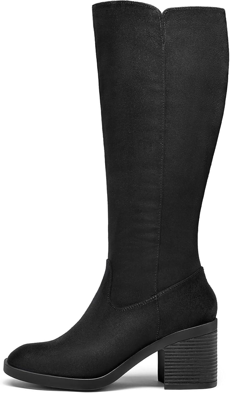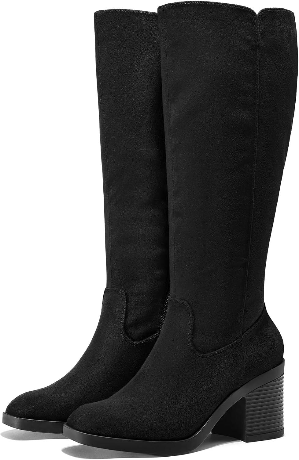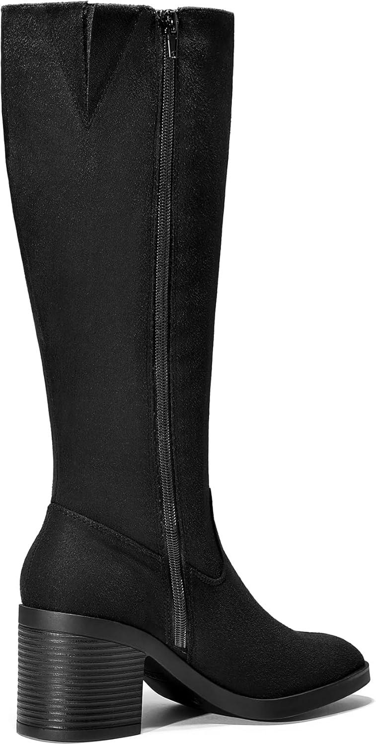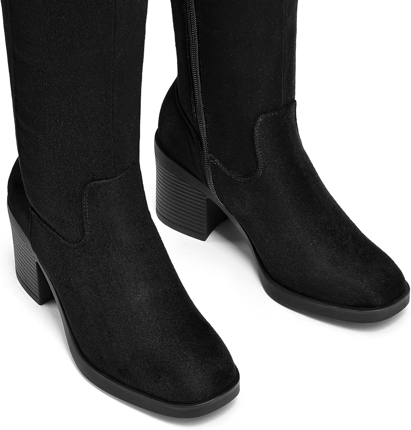 mysoft Women’s Knee High Boots Square Toe Chunky Block Stacked Heel Tall Boots with Side Zipper(Black Suede)