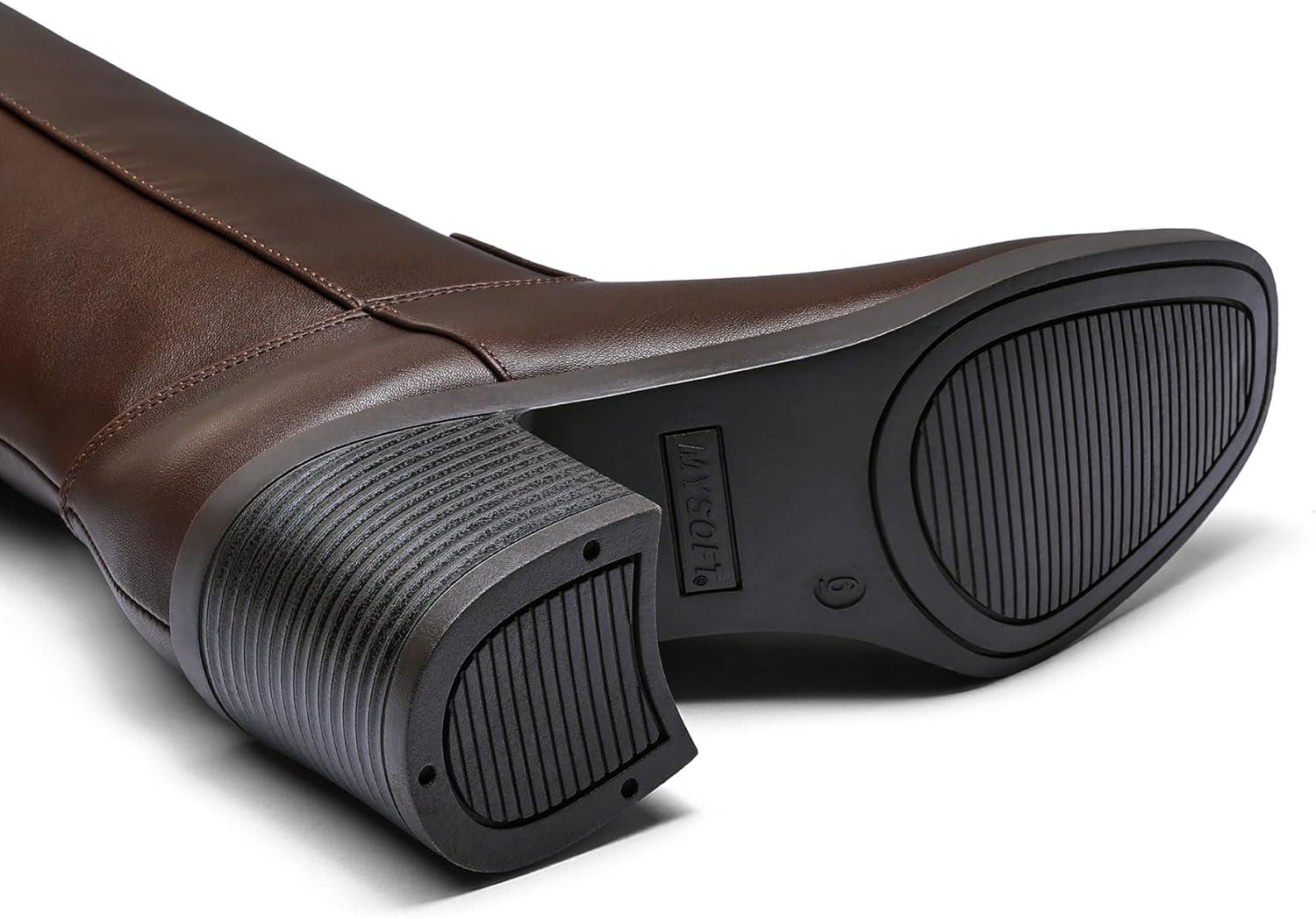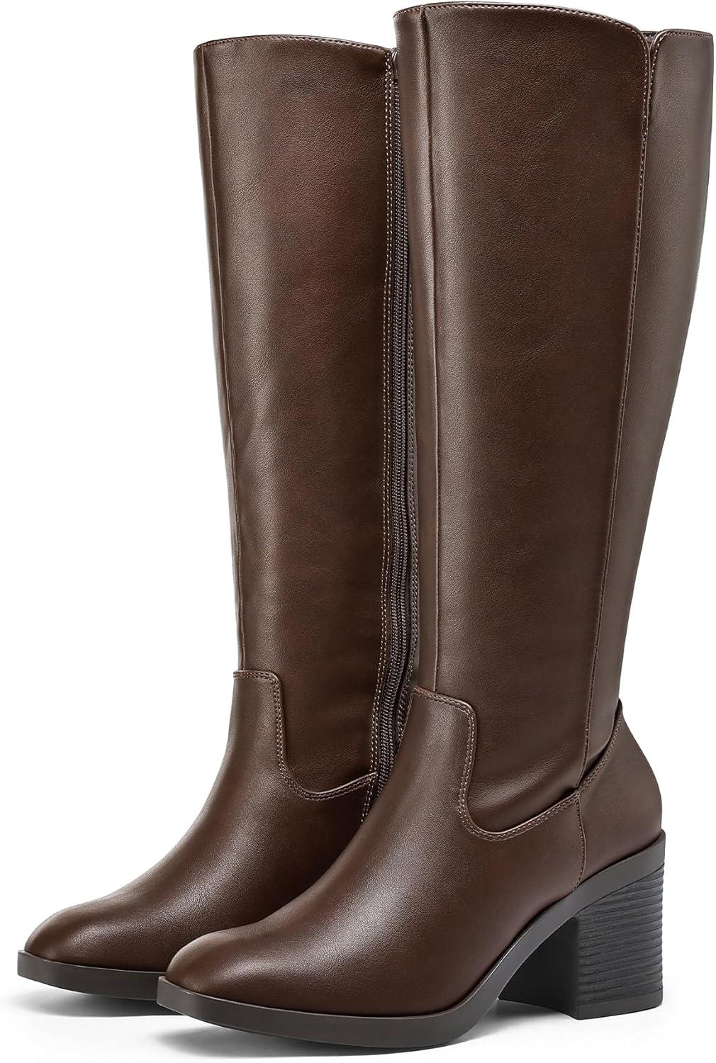 mysoft Women’s Knee High Boots Square Toe Chunky Block Stacked Heel Tall Boots with Side Zipper(Brown)