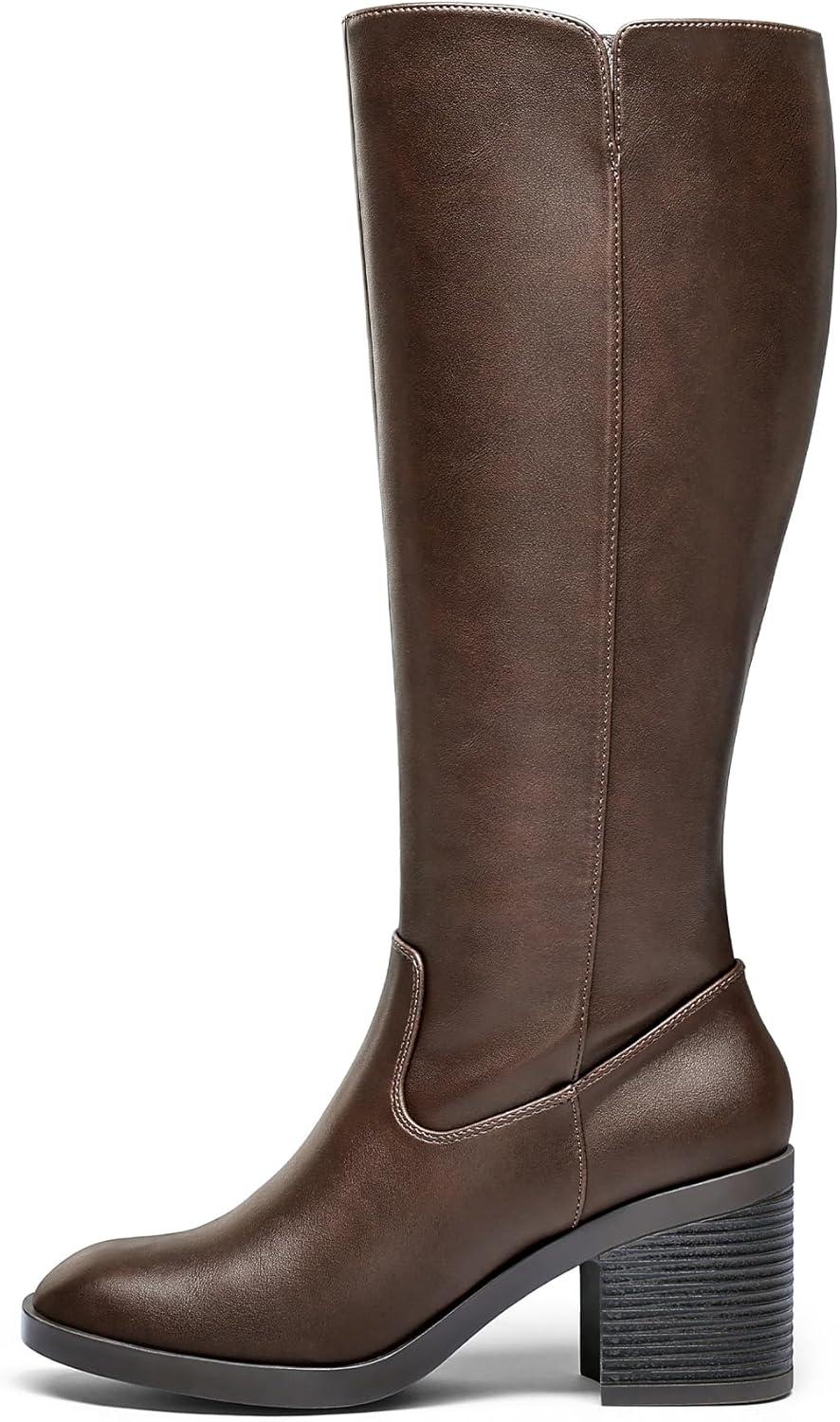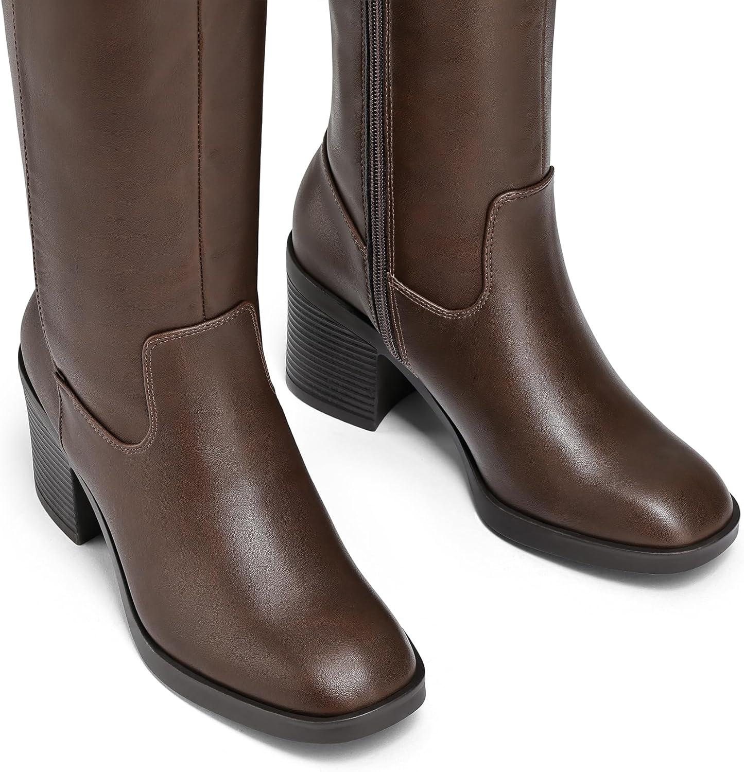 mysoft Women’s Knee High Boots Square Toe Chunky Block Stacked Heel Tall Boots with Side Zipper(Dark Brown)