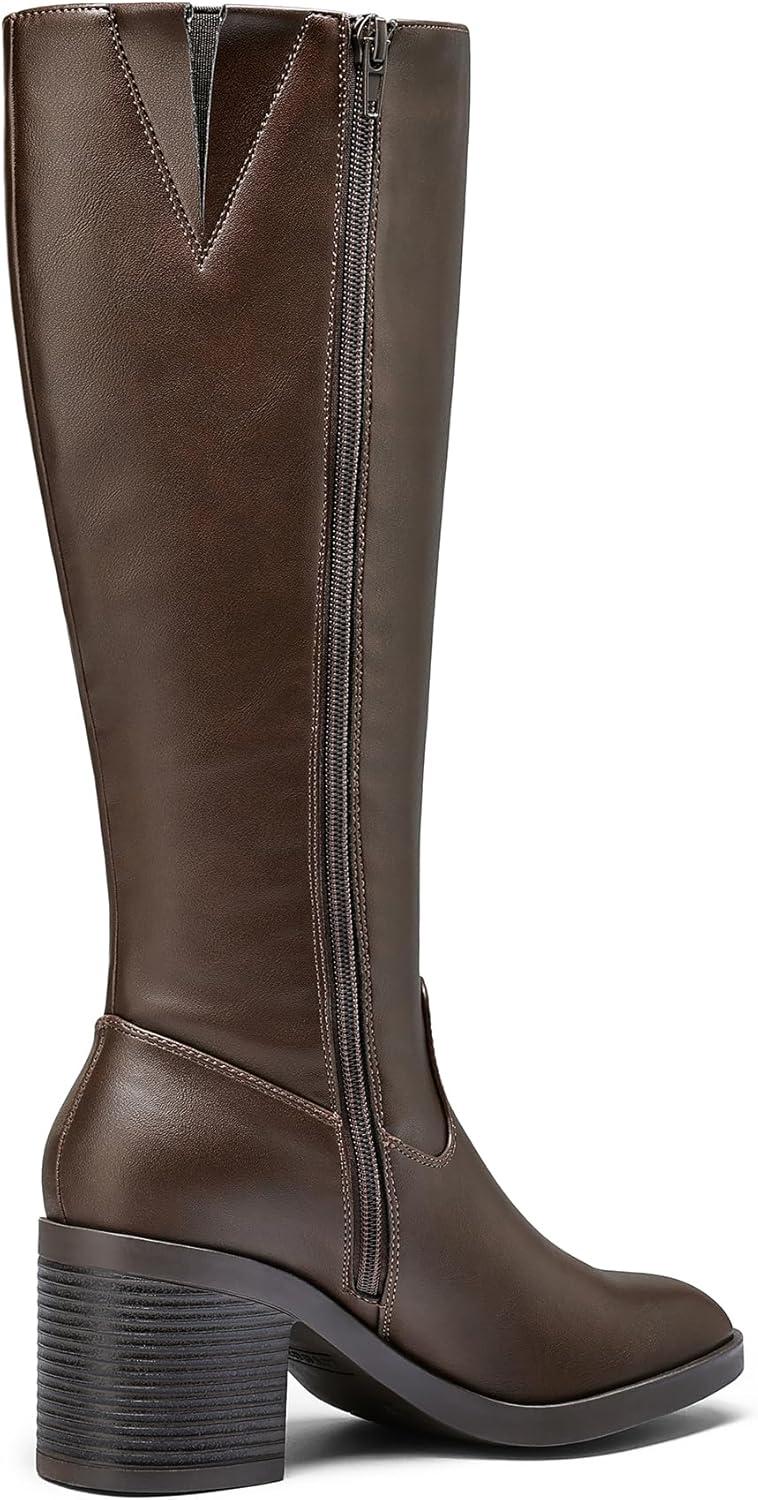 mysoft Women's Knee High Boots Square Toe Chunky Block Stacked Heel Tall Boots with Side Zipper(Dark Brown)
