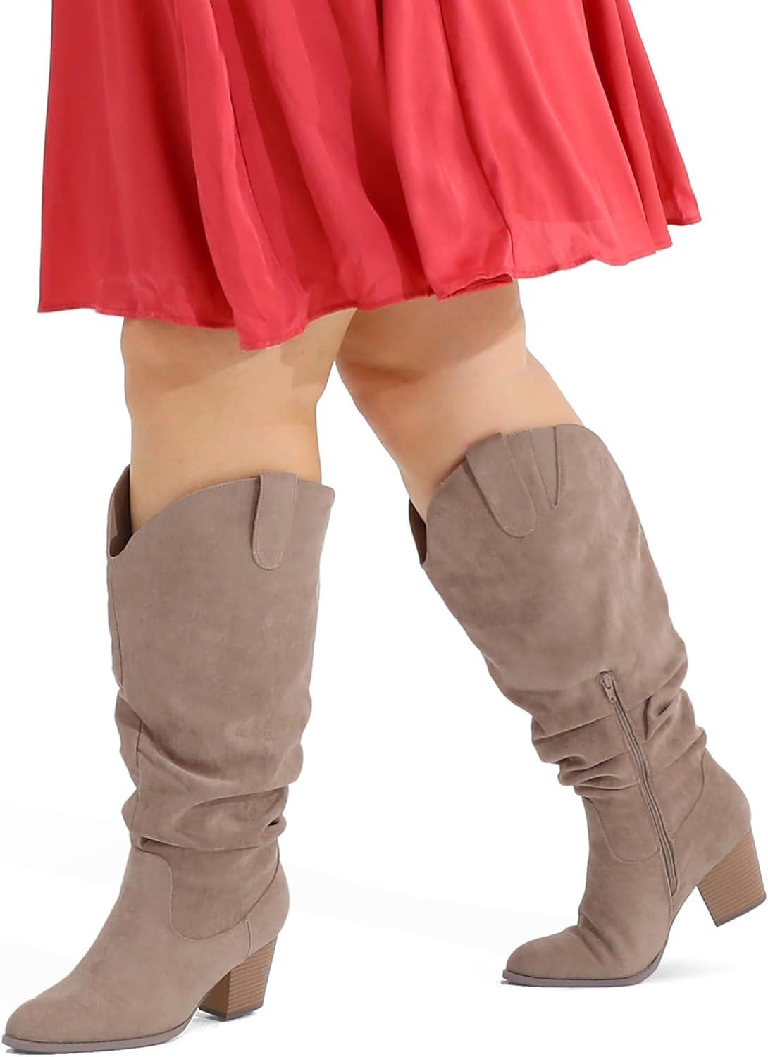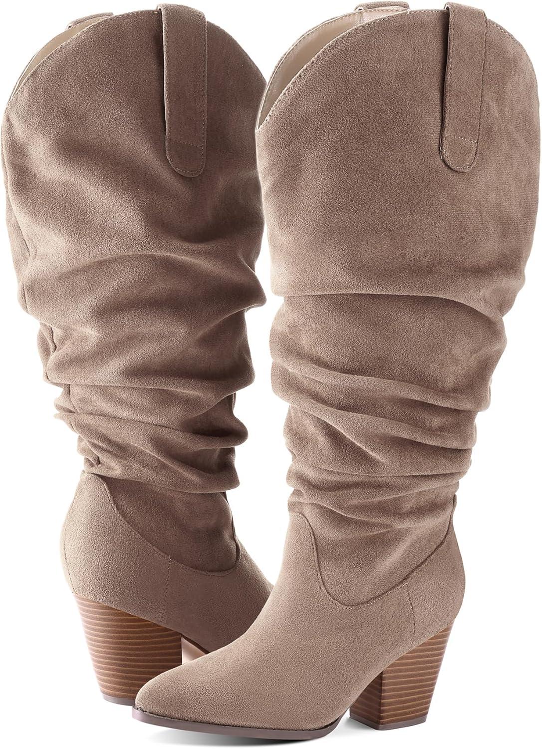 mysoft Women’s Wide Calf Knee High Boots Cowgirl Low Chunky Stacked Heel Wide Width Pointed Toe Slouchy Tall Boots with Zippers(Taupe Extra Wide Calf)