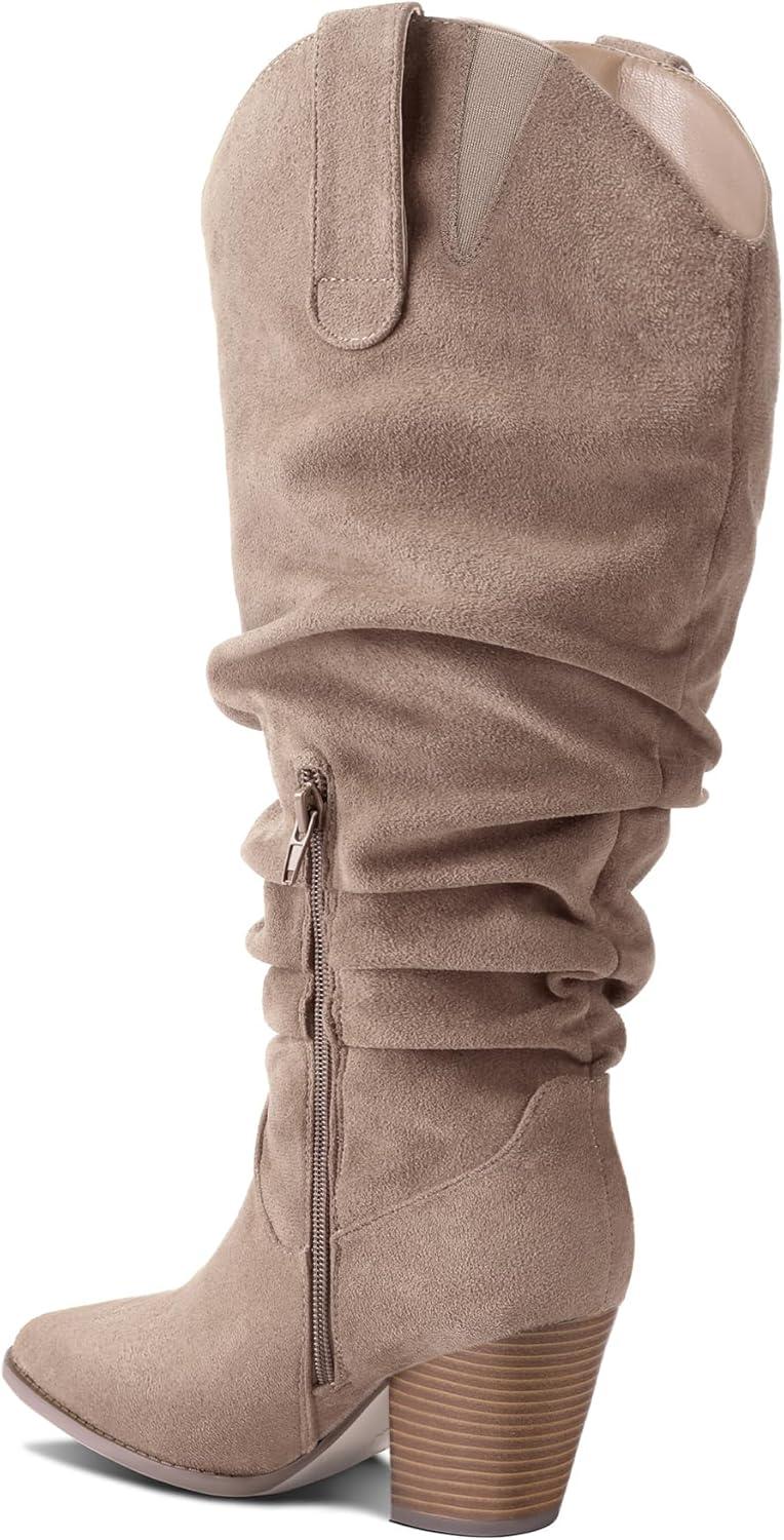 imagemysoft Womens Wide Calf Knee High Boots Cowgirl Low Chunky Stacked Heel Wide Width Pointed Toe Slouchy Tall Boots with ZippersTaupe Extra Wide Calf