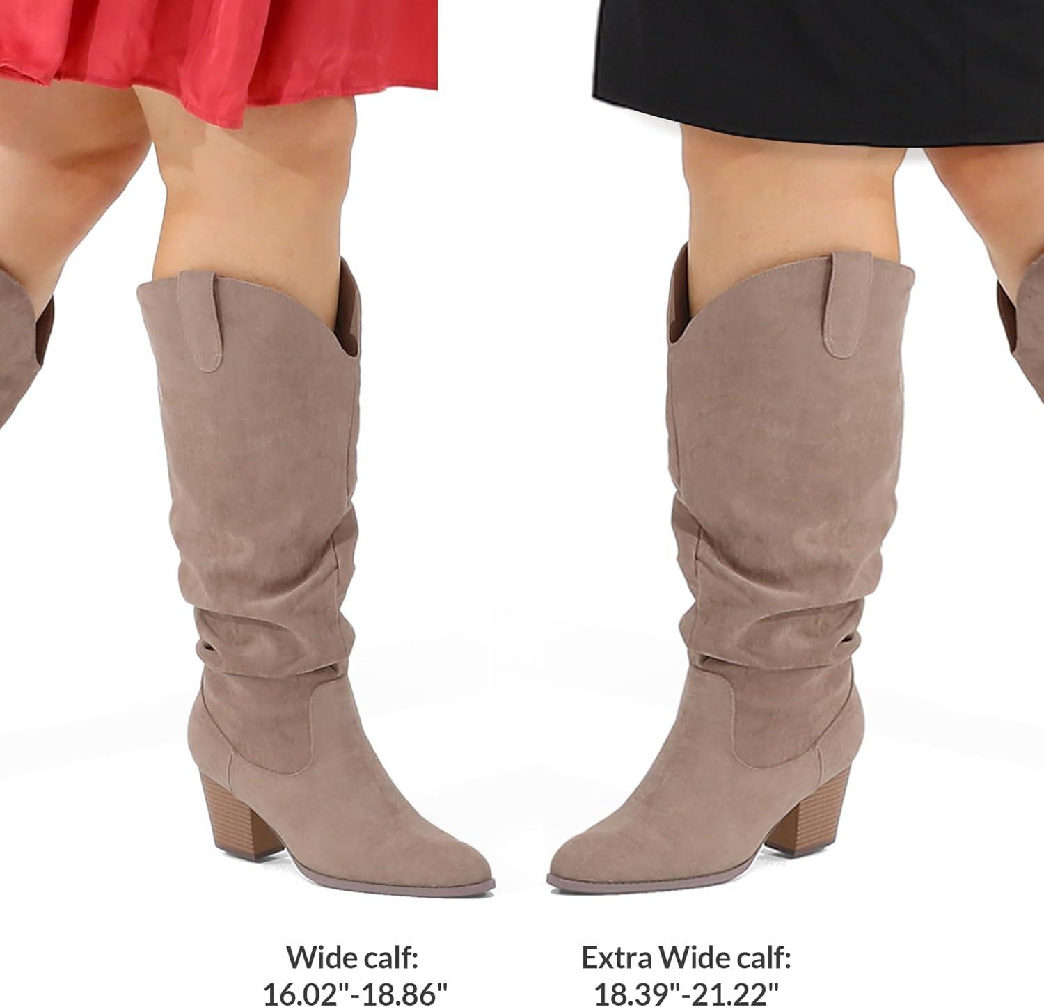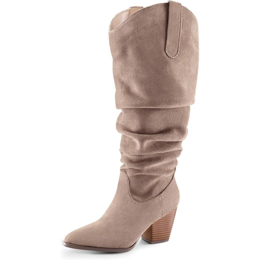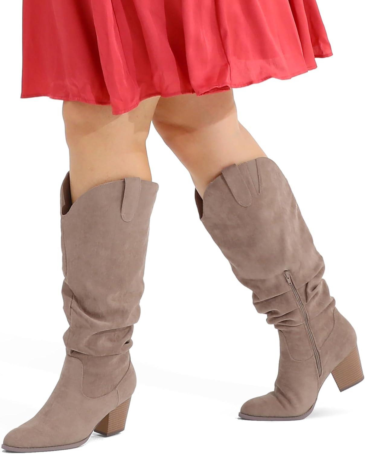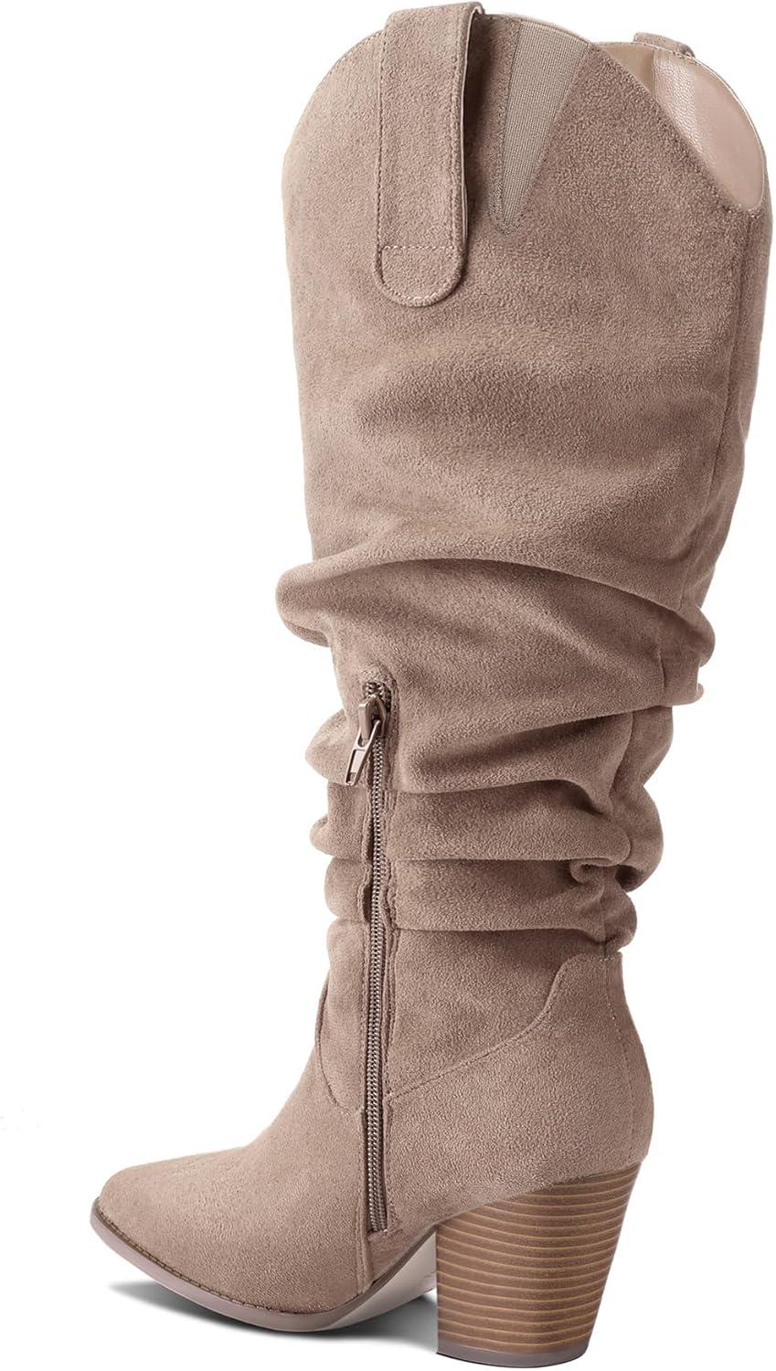 imagemysoft Womens Wide Calf Knee High Boots Cowgirl Low Chunky Stacked Heel Wide Width Pointed Toe Slouchy Tall Boots with ZippersTaupe Wide Calf