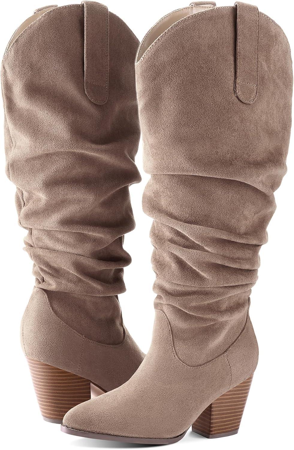 mysoft Women's Wide Calf Knee High Boots Cowgirl Low Chunky Stacked Heel Wide Width Pointed Toe Slouchy Tall Boots with Zippers(Taupe Wide Calf)